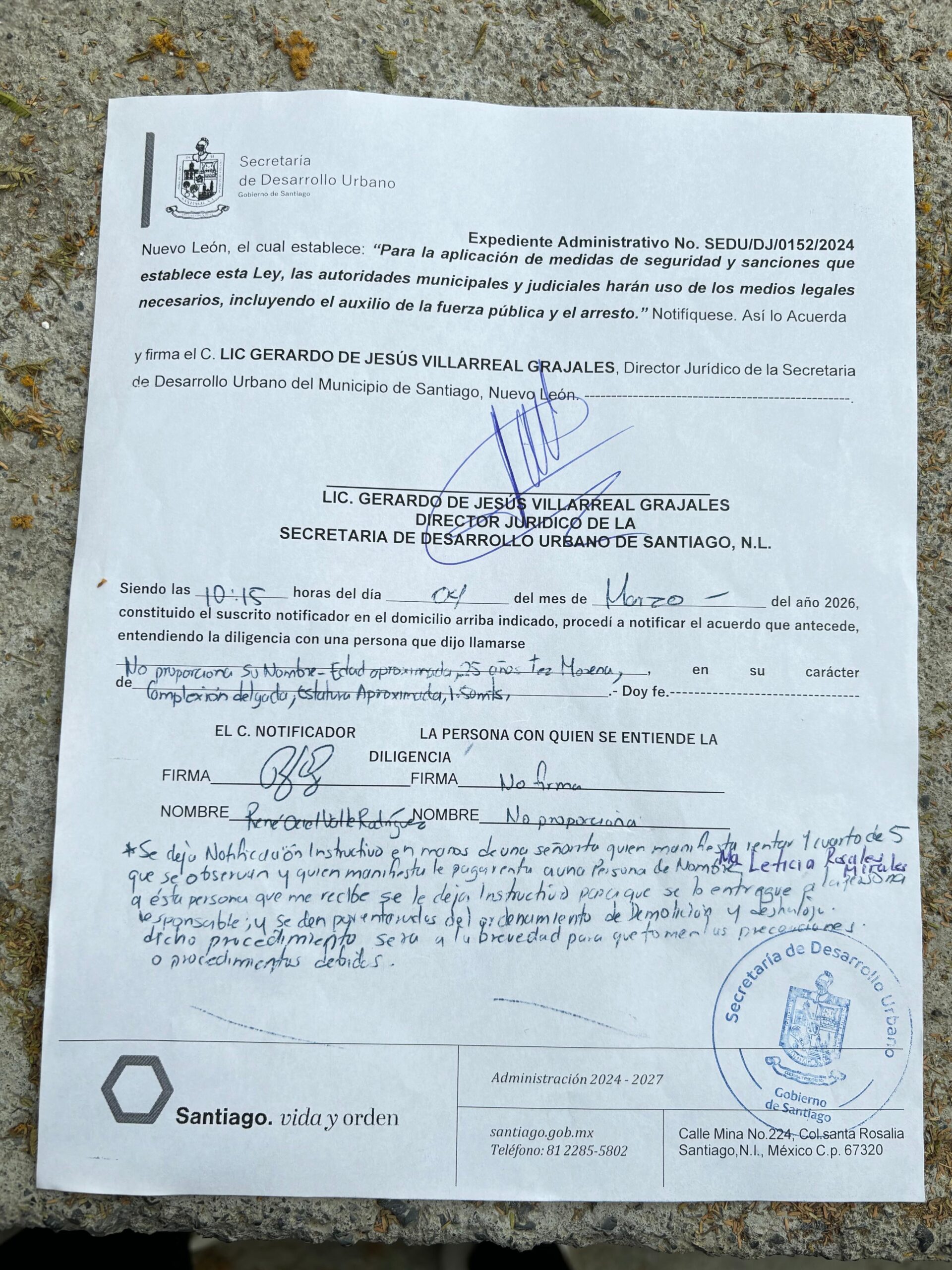 «Se dejo notificación instructivo, en manos de una señorita quien manifiesta rentar un cuarto de cinco que se observan y quién manifiesta le paga renta a una persona de nombre María Leticia Rosales Morales que esta persona que me recibe se le deja instructivo para que se le entregue a la persona responsable y se den por enterados del ORDENAMIENTO DE DEMOLICIÓN Y DESALOJO, dicho procedimiento será a la brevedad para que tomen las precauciones o procedimientos debidos». Dicta el documento que entregan con sello del Gobierno de Santiago y firma del Director Jurídico de Desarrollo Urbano.