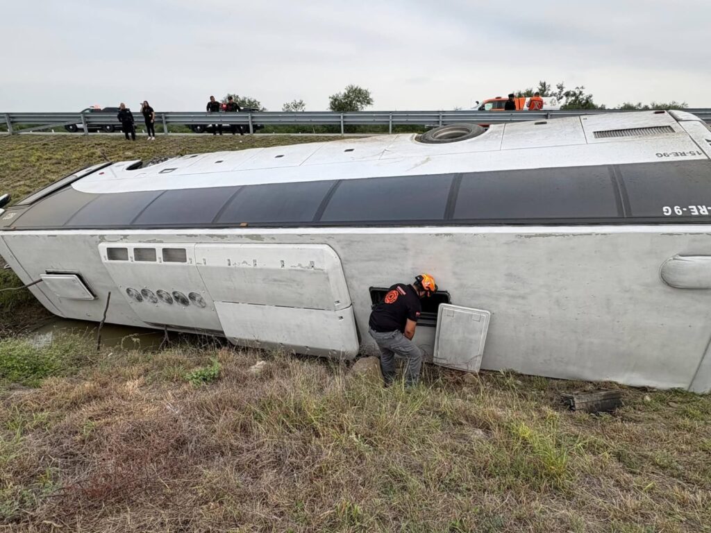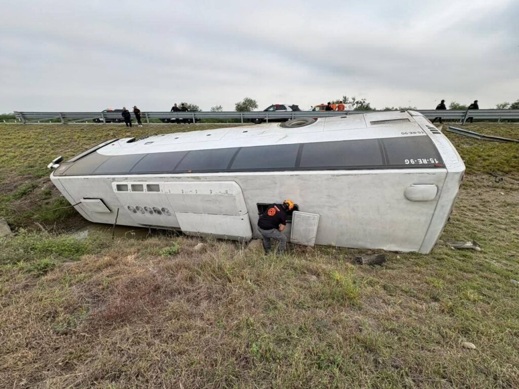 La volcadura de un autobús de pasajeros se registró en la carretera Monterrey Reynosa altura de Los Ramones.